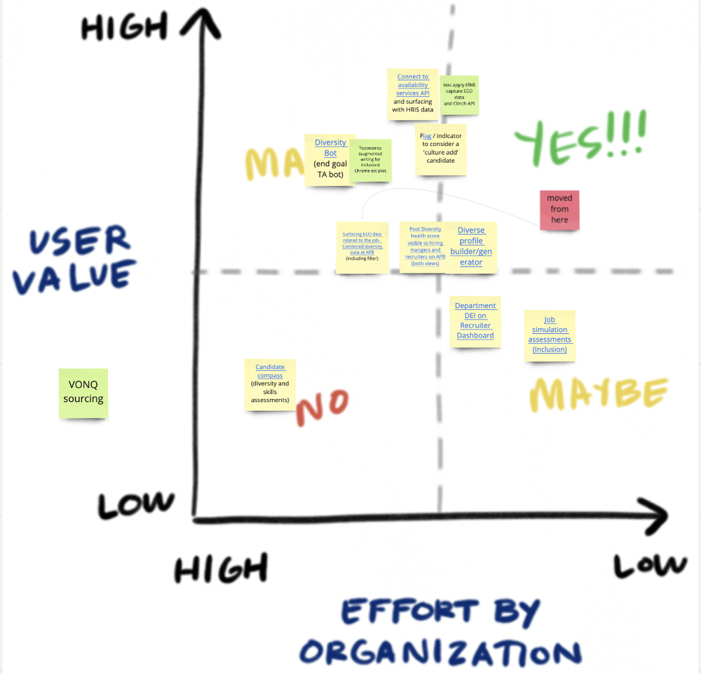 With the ticking time, we decided to prioritize the idea of the Diversity Dashboard, as with the guidance of the other team (already working on the dashboard), the effort required to build the DEI dashboard is low and super quick. Now we don’t have to build the dashboard from scratch and can use the existing template, reducing the time to build. So we decided to skip the experimentation and quickly validate the dashboard with the users.